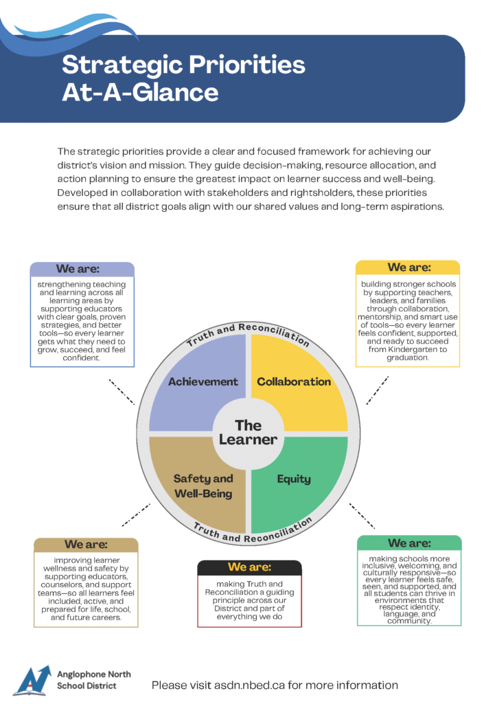The Anglophone North School District community commits to engaging learners in an inclusive environment that embraces teamwork, responsibility, innovation and personal excellence. The District Improvement Plan has served as our guide for this work over the past three years, helping us set goals, outline actions, and track progress. The priorities of the plan are aligned with the Ten-Year Education Plan: Everyone at Their Best.