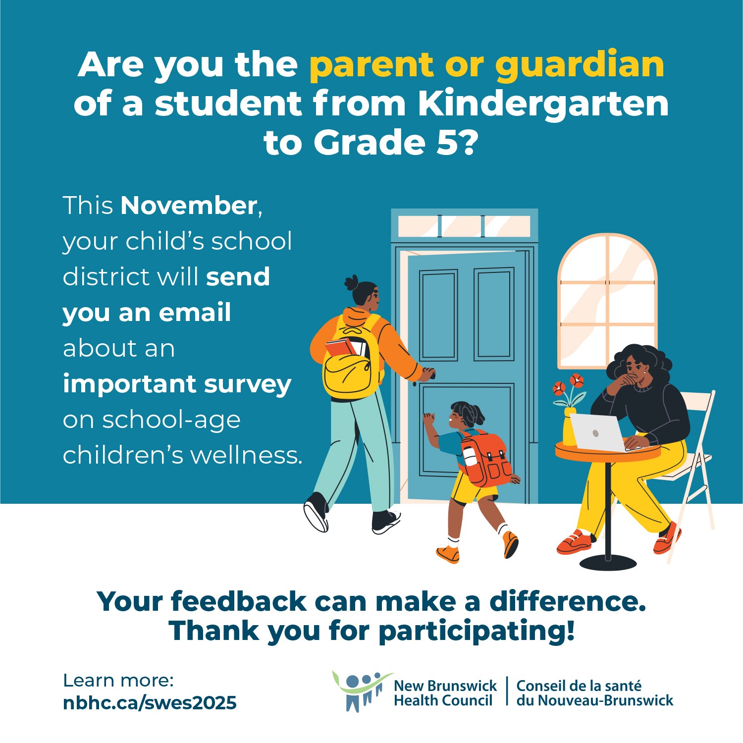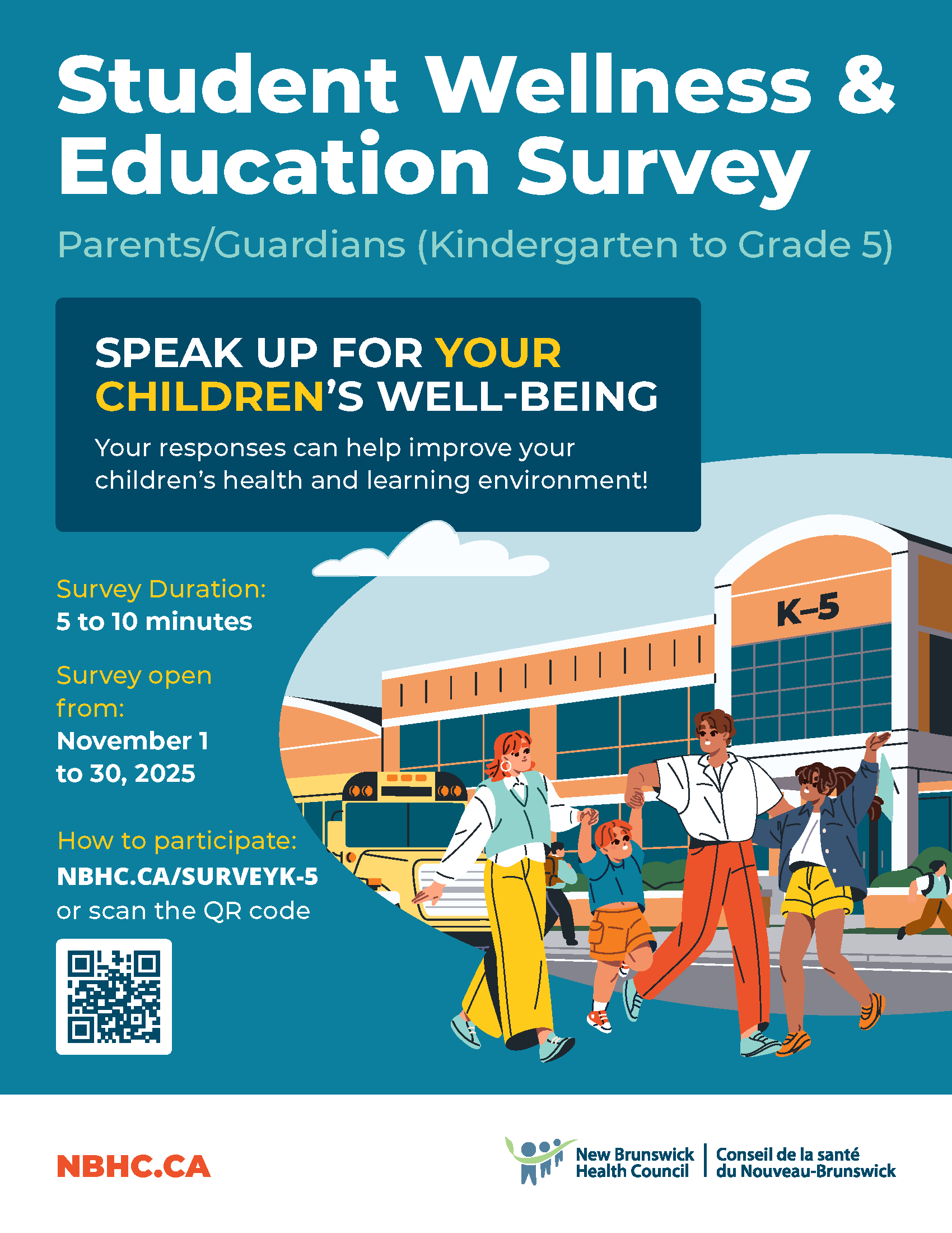This survey collects important information about student wellness, including social and emotional development, physical health, experiences at school, and life in the community. The feedback shared by families helps schools, districts, and partners across New Brunswick strengthen programs and supports that contribute to student well-being.